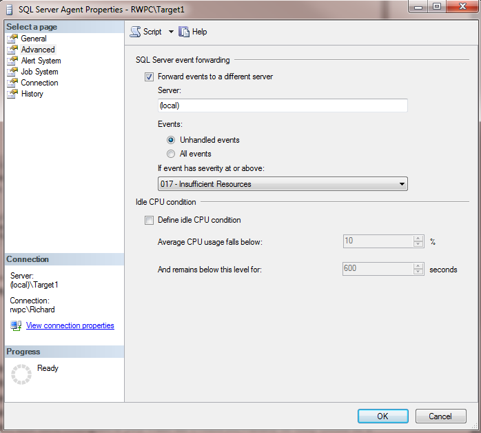 You can also configure SQL Server error events to be forwarded to a central server, such as your MSX server. This will generate additional network traffic, but you can then view all of the relevant events from your TSX servers on the central server as well. Right-click on the SQL Server Agent node in SSMS, select properties, and then the Advanced tab. You can select the option to “Forward events to a different server”, enter your server name, and then configure if you want all events forwarded or only errors of a particular severity. For example, Figure 12 shows a configuration that only forwards unhandled system events (severity 17 or higher) to the MSX server.