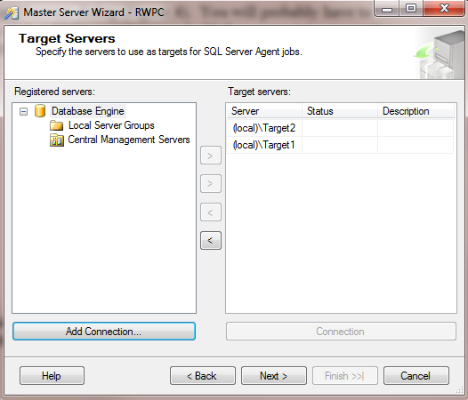 Click Next, you are presented with the Target Servers dialog (Figure 4). You will probably have to register your connections in this dialog, so click Add Connection… and add the appropriate connection. For the purposes of this step, you will use the local instances Target1 and Target2. You can always come back later and add or remove servers or instances.