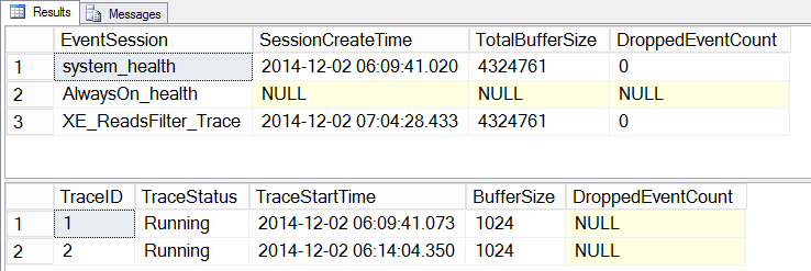 /* Extended Events */ SELECT [es].[name] AS [EventSession], [xe].[create_time] AS [SessionCreateTime], [xe].[total_buffer_size] AS [TotalBufferSize], [xe].[dropped_event_count] AS [DroppedEventCount] FROM [sys].[server_event_sessions] [es] LEFT OUTER JOIN [sys].[dm_xe_sessions] [xe] ON [es].[name] = [xe].[name]; GO