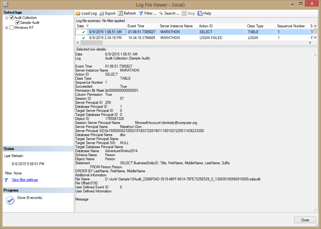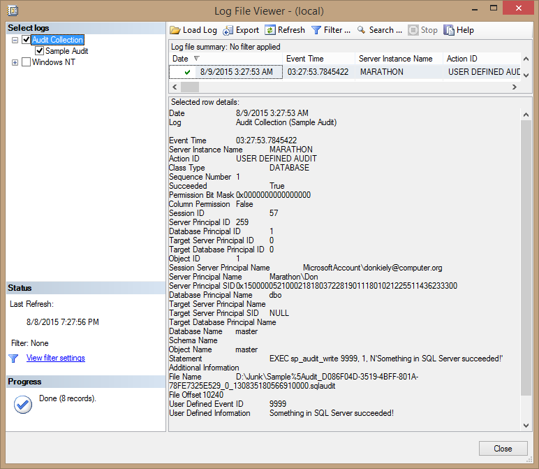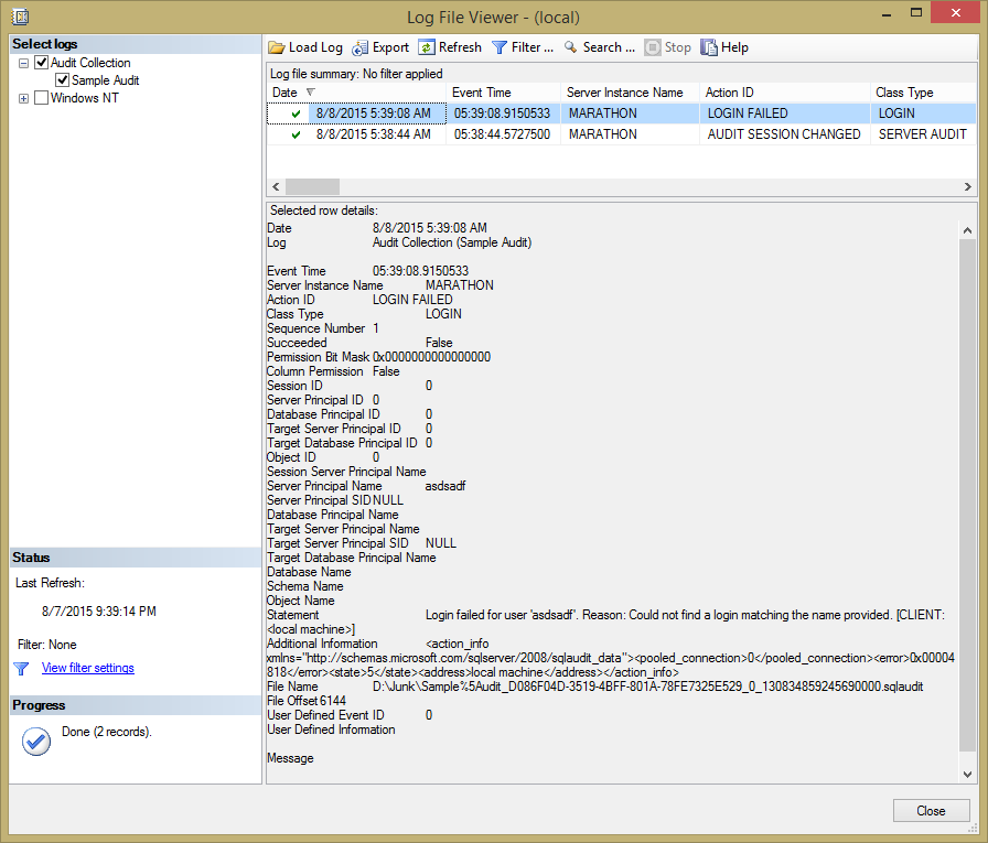 Figure 11.5: Viewing the server audit log entries for the Sample Audit.