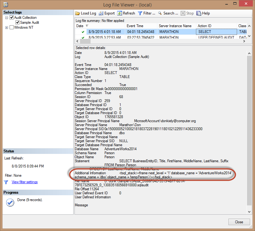 Notice in the figure that the Additional Information item has no content. This is because the event that generated the log entry was a direct SELECT statement. But when the SELECT statement executes within a stored procedure or other code module, Additional Information will contain the T-SQL stack frame information as a chunk of XML code. This is useful to identify whether the query was executed as a statement or a code module.