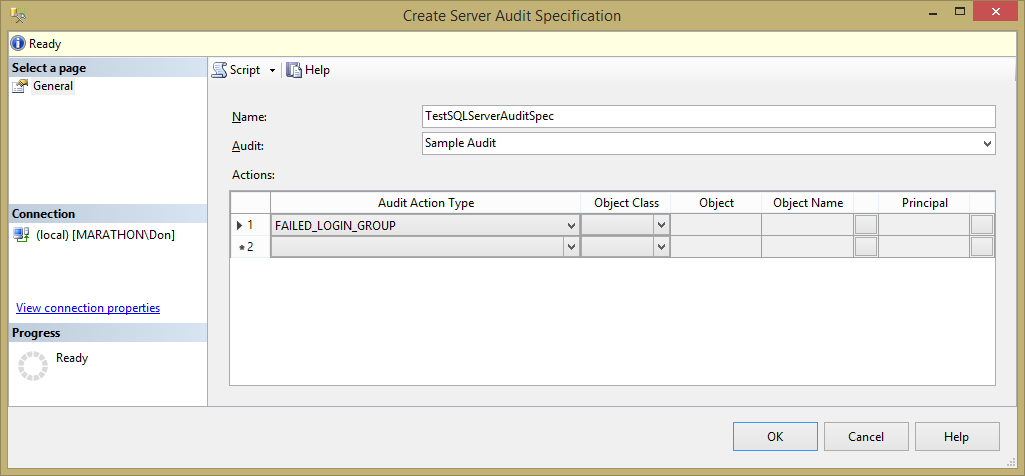 - Server Audit Specification: Use this object to define specific server-level events to capture in the audit log. This specification is associated with exactly one server audit that you created previously. Here is where you define which events on which objects you want to record.