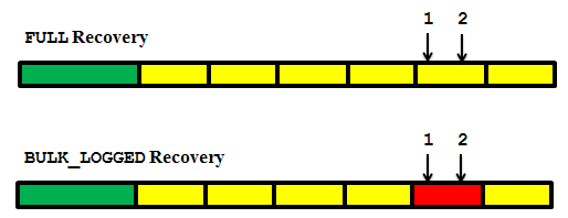 Let's take a look an example of how minimally logged operations can affect a point-in-time restore. Figure 6.8 depicts an identical backup timeline for two databases. The green bar represents a full database backup and the yellow bars represent a series of log backups. The only difference between the two databases is that the first is operating in FULL recovery model, and the second in BULK LOGGED.