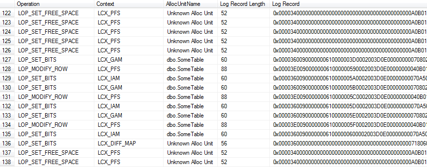 This time, the log records for the changes made to SomeTable appear in the context of Global Allocation Maps (GAMs) and Index Allocation Maps (IAMs), tracking extent allocation, plus some PFS pages. In other words, SQL Server is logging the extent allocations (and any changes to the metadata, i.e. system tables, which we don't show in Figure 6.3), but the data pages themselves are not there. There is no reference in the log as to what data is on the allocated pages. We do not see here the 0x61 pattern that appeared in the log records for the FullRecovery database, and most of the log records are around 100 bytes in size.
