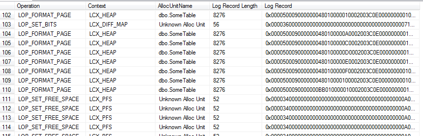 The log records describing the changes made to SomeTable are all of type LOP_FORMAT_PAGE; they always appear in sets of 8, and each one is 8,276 bytes long. The fact that they appear in sets of 8 indicates that SQL Server was processing the insert one extent at a time and writing one log record for each page. The fact that each one is 8,276 bytes shows that each one contains the image of an entire page, plus log headers. In other words, for the INSERT…INTO command, and others that SQL Server will minimally log in BULK_LOGGED recovery, SQL Server does not log every individual row when run in FULL recovery; rather, it just logs each page image, as it is filled.