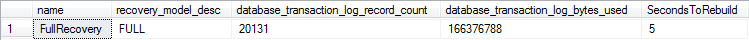 Let's now rebuild the clustered index (consisting of 20,034 pages, according to sys.dm_db_index_physical_stats) in our FULL recovery model database, and see how much log space the index rebuild needs, using with the sys.dm_tran_database_transactions DMV.
