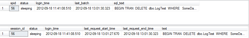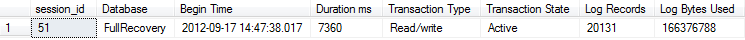 In SQL Server 2005 and later, we can use the sys.dm_tran_session_transactions and sys.dm_tran_database_transactions DMVs to gather information specific to the open transaction, including the transaction start time, number of log records used by the open transaction, as well as the bytes of log space used, as we saw previously in Listing 7.1. Listing 7.9 shows a simplified version, with sample output.