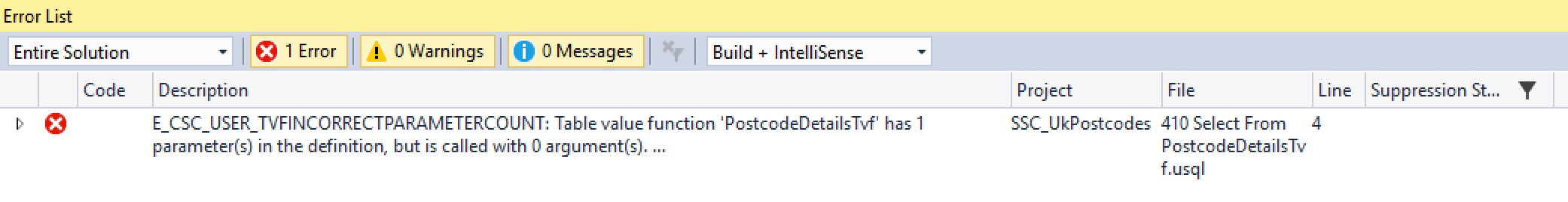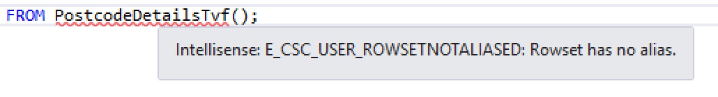 We’ve seen most of this before, the only difference is the SELECT line, which is using the PostcodeDetailsTvf() function. Note it has been aliased as “AS postcodes”. A TVF is deemed to be an anonymous rowset, so it must have an alias specified for it. If you do not specify an alias, you’ll see this error:
