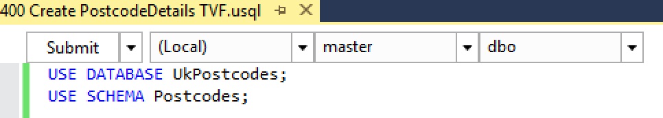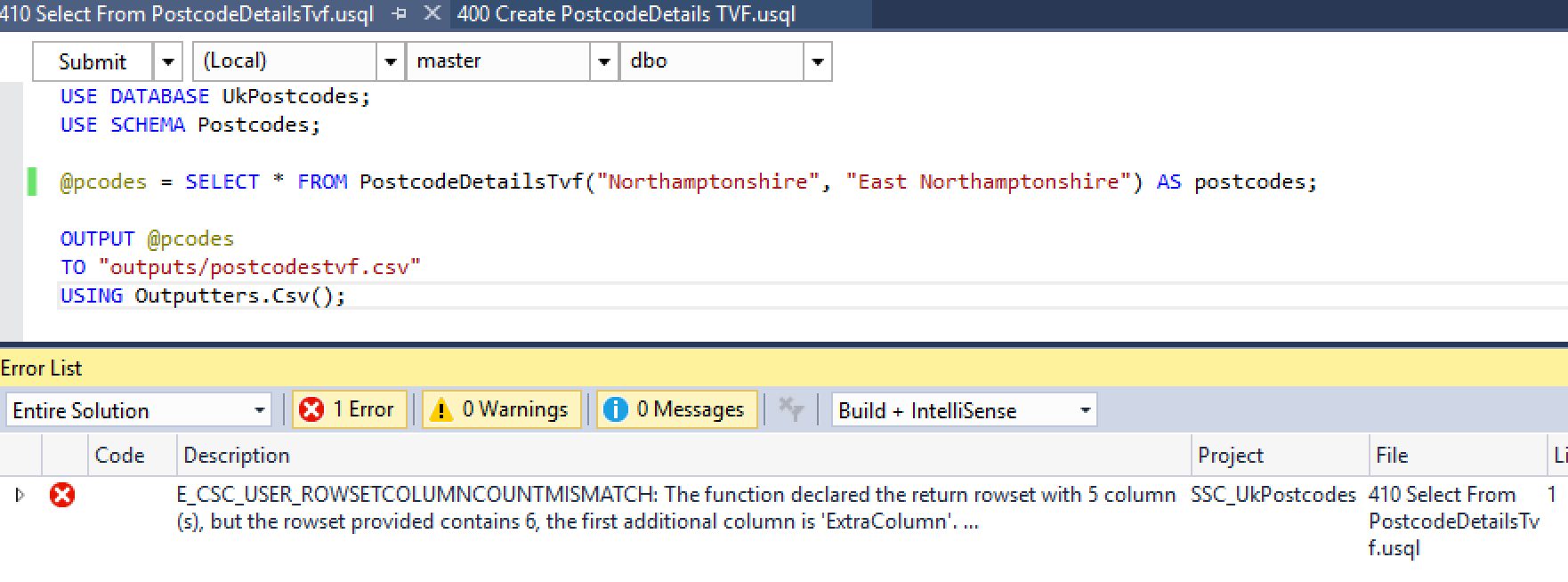 We’ll recreate the function as a TVF. If you’ve been following along with the series, open up the Visual Studio project. If you haven’t (where have you been?!), download the code from GitHub and then open it up in VS. Once you have the project sitting in front of you, either add a new script called 400 Create PostcodeDetails TVF.usql, or open the file of the same name (if you do use the GitHub project, the code won’t look the same at the moment as this isn’t the finished version of the function!). Here’s the code for that script: