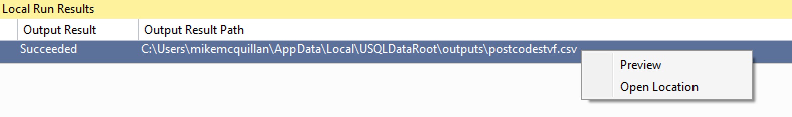 Run this script to generate the postcodestvf.csv file. Once executed, the Local Run Results window will appear. Right-click on the file name and open it (you can either preview it or open the file’s location, which will then allow you to open it in Notepad (other text editors are available).