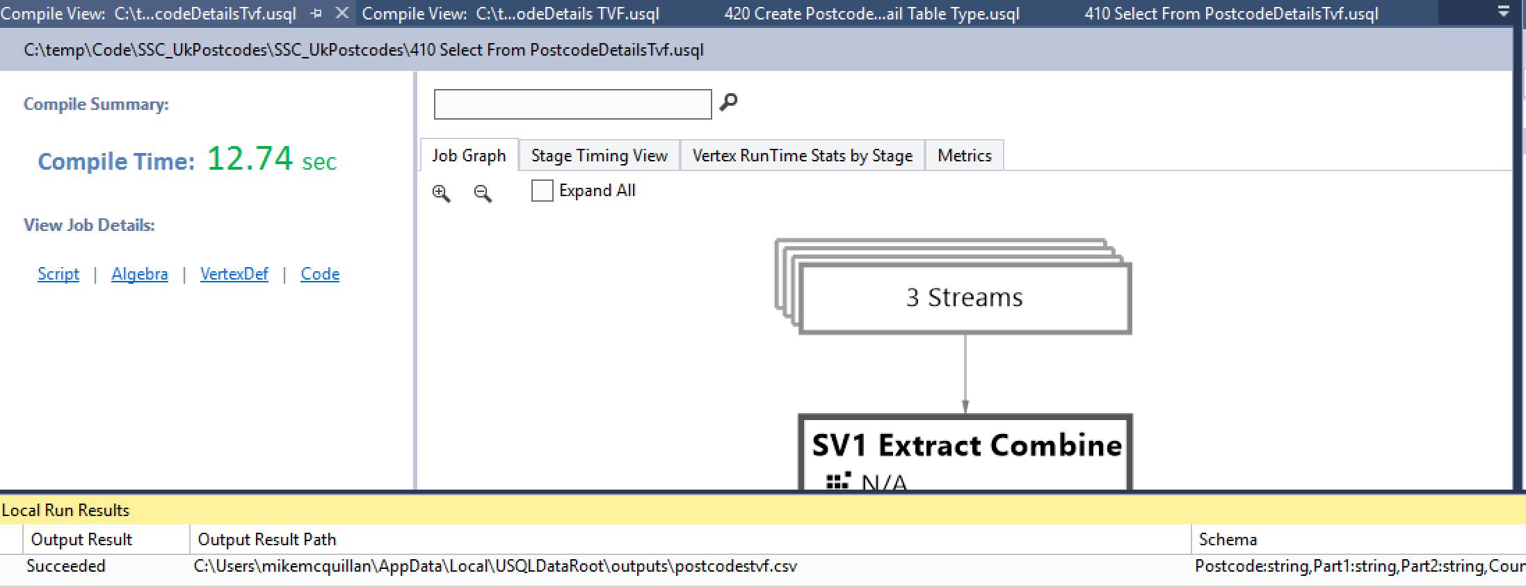 OK, we have a TVF and we’re not afraid to use it! Either open or add the script 410 Select From PostcodeDetailsTvf.usql, ensuring it has this code embedded within it: