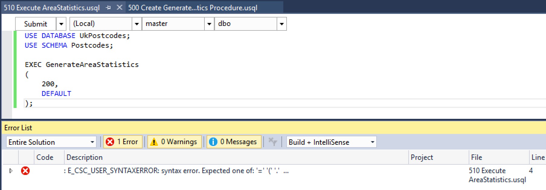 In the GitHub project, open up script 200 Populate Tables.usql. If you have already created the tables, running this will repopulate them (I’ve added the TRUNCATE TABLE statement here, which U-SQL supports). If you haven’t created the tables (or, indeed, the database), run scripts 010 to 060 first. All done? Cool, let’s create a stored procedure!