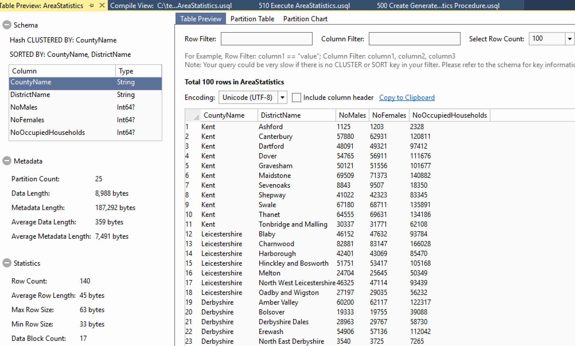 Creating a stored procedure is all well and good, but it isn’t much use to us just sitting in a database. Happily, it’s as easy to use a stored procedure in U-SQL as it is in T-SQL. If you downloaded the code from GitHub, you already have script 510 Execute AreaStatistics.usql. If you don’t have it, create it. Here’s the code: