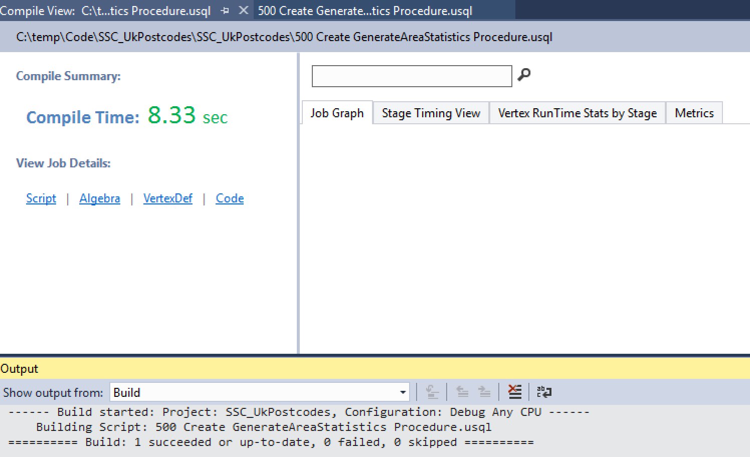 If you’ve pulled the code from GitHub, open the solution in Visual Studio 2015. You’ll already have script 500 Create GenerateAreaStatistics Procedure.usql. If you don’t have it and you’ve been following along, open your own solution and create an empty script with the same name.