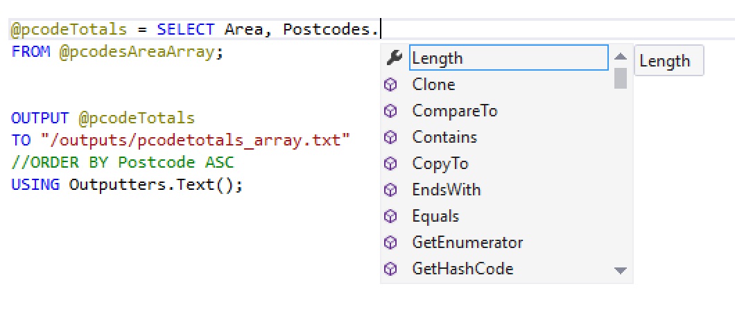 C# arrays are very powerful – we’re on the tip of the iceberg here. For instance, you can tell U-SQL to return all array elements that only match a certain pattern, to group array values, or to return only substrings of array values. There are lots of other things you can do too, but I’ll leave them as an investigative exercise for the reader. I will show you how to find out what is available though.