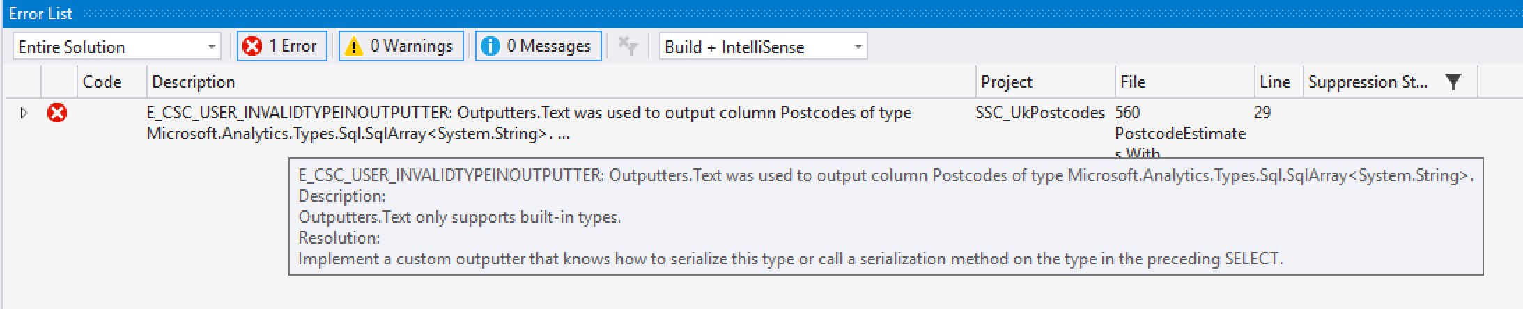 EXPLODE returns a rowset of the appropriate type, placing each item in the array into its own row. The type being used for this array is a string. ae.Postcodes (inside the brackets) is the SQL.ARRAY column we wish to explode out. Finally, we assign a table name (pc) and column names (just one in this case – Postcode) to the APPLY. The end result is a rowset, which is applied to the query. If U-SQL allowed us to output a SQL.ARRAY column using a statement like SELECT * FROM @pcodesAreaArray (it doesn’t – you’ll see the error in the screenshot displayed above if you try it), we’d have returned data in the format we saw earlier: