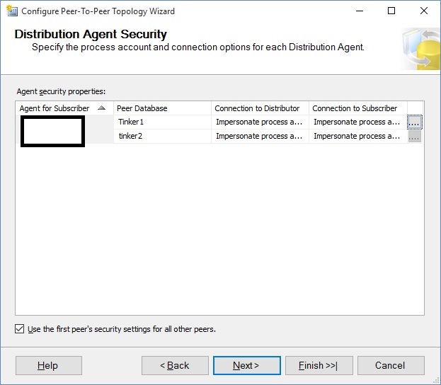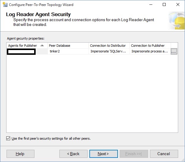 When you have all of the peers included, click Next. You then need to set Log Reader security for the all of the new peernodes, which will be listed on the window that I snapshotted below (Please note that I again used the process account of the agent, a no-no in production, in order to expedite this presentation).