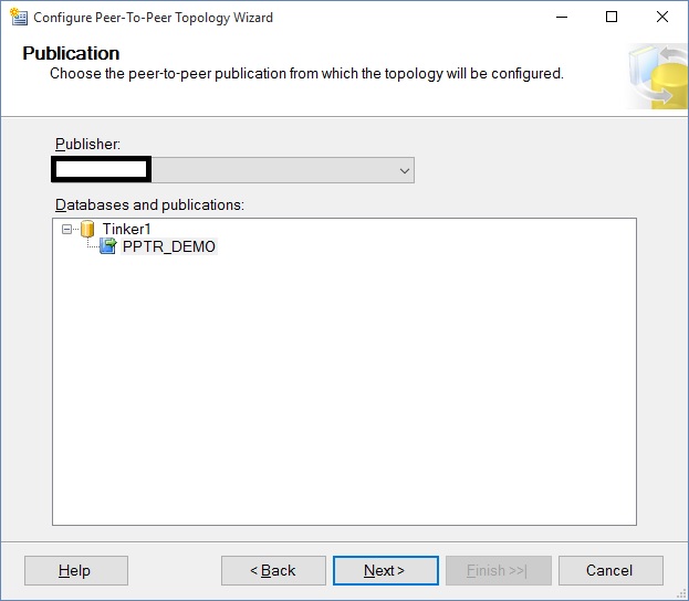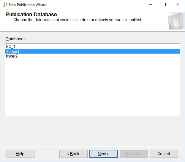 GOAfter that, you can create the Peer-To-Peer replication topology. Choose Tinker 1 Database in the New Publication Wizard and click Next: