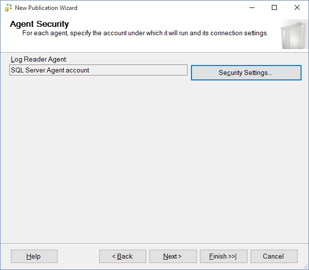 You are then asked for security for the Log Reader Agent, if one is not already installed for another publication from that database (I am being naughty here and using the SQL Server agent account; that is a security vulnerability in production).
