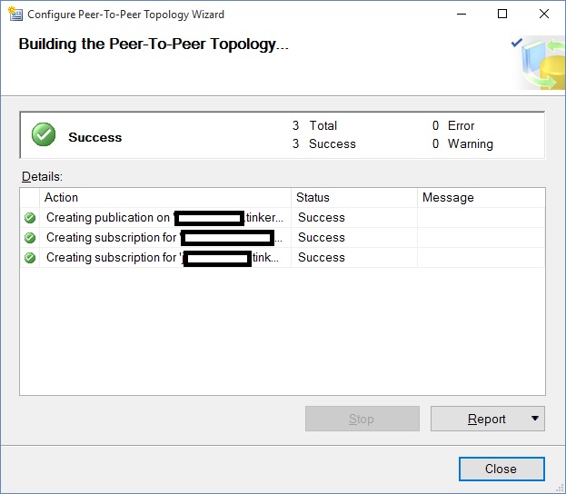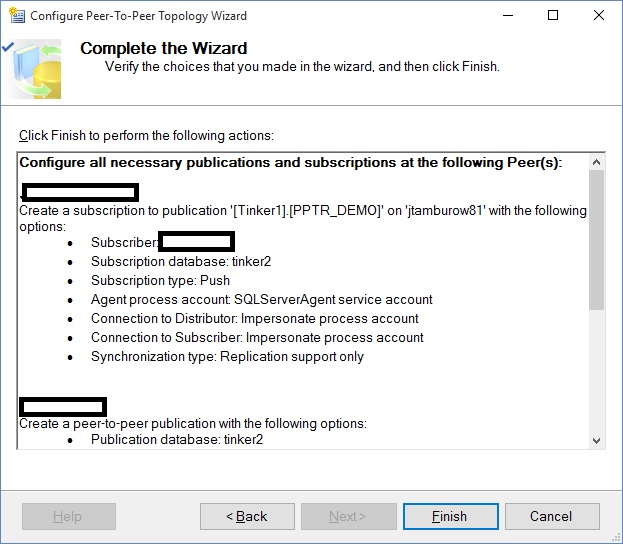 In the next article, we will discuss stability and troubleshooting. There are some tips and tricks that will make peer-to-peer replication easy to maintain. I've learned the the hard way, with all-nighters on weekends with angry vice-presidents on the conference bridge. Hopefully, if you have the need to PPTR, what I share will help you have an easy time to implement.