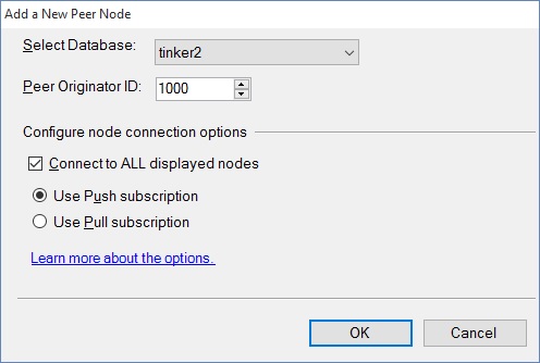 Choose the "Add a New Peer Node option.you will get a connection window, connect to the server hosting the database that is joining the topology. This can be the same as the server on which the database runs. You will get this window to ask for the peer database on that server: You also have to choose the Peer originator ID. this is important to resolving conflicts. The node with the highest number wins conflicts. And, unfortunately, someone has to win - no ties allowed.