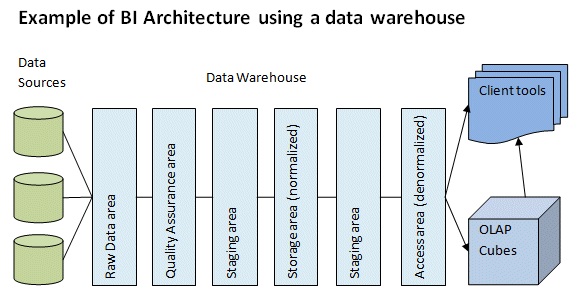 Business Intelligence (BI) provides historical, current and predictive views of business information. The aim is to support better decision making. Historically, BI has been focused on historical information because the time it takes to extract data from multiple sources and ensure data consistency in the underlying data warehouse. An example of a BI architecture with a data warehouse is pictured below.
