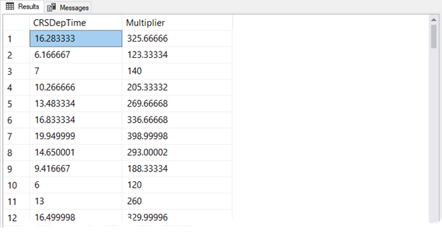 EXEC sp_execute_external_script @language = N'R' , @script = N' x <- as.matrix(AirportDelayInput); y <- array(Multiplier); z <- as.data.frame(x %*% y); OutputDataSet <- data.frame(x, z);' , @input_data_1 = N'SELECT top 100 CRSDeptime AS Col1 from AirlineDemoSmall where CRSDeptime > 1;' , @input_data_1_name = N'AirportDelayInput' , @params = N'@Multiplier int' , @Multiplier = 20 WITH RESULT SETS( ([CRSDepTime] float not null, [Multiplier] float not null));