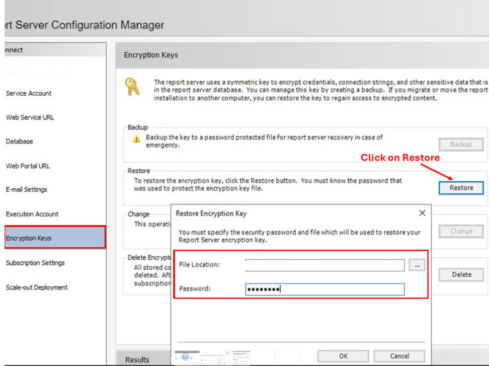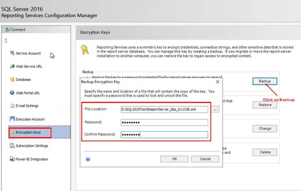 Next, backup the SSRS encryption keys from the source as it is required later while configuring PBIRS.