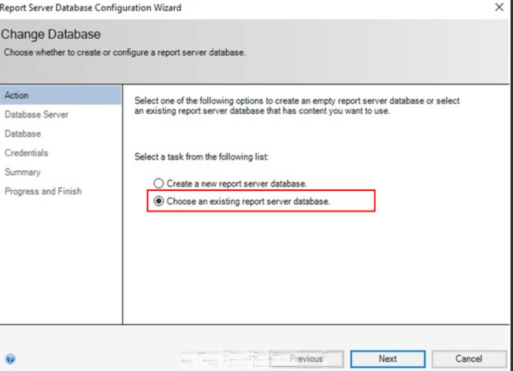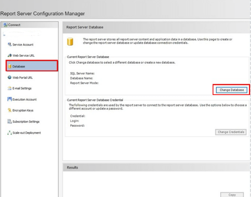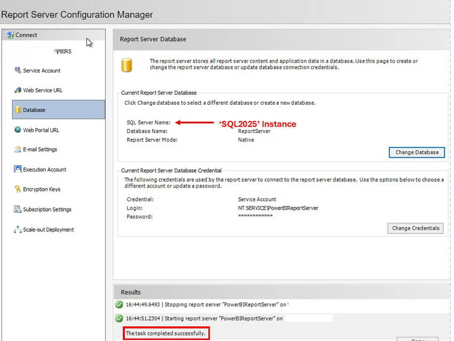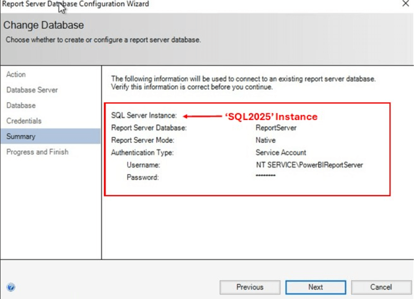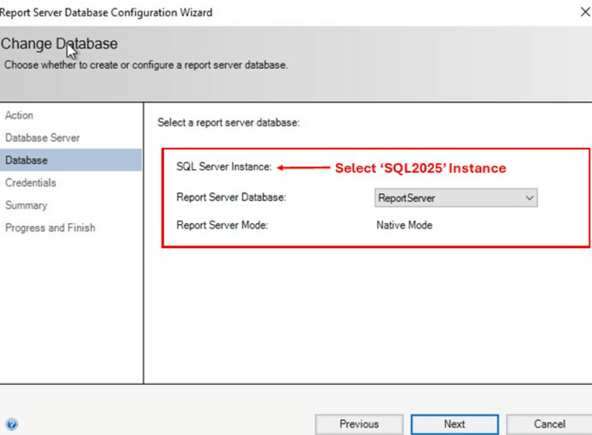 Connect to the SQL 2025 Instance and select ReportServer database which you have restored. Then click Next.