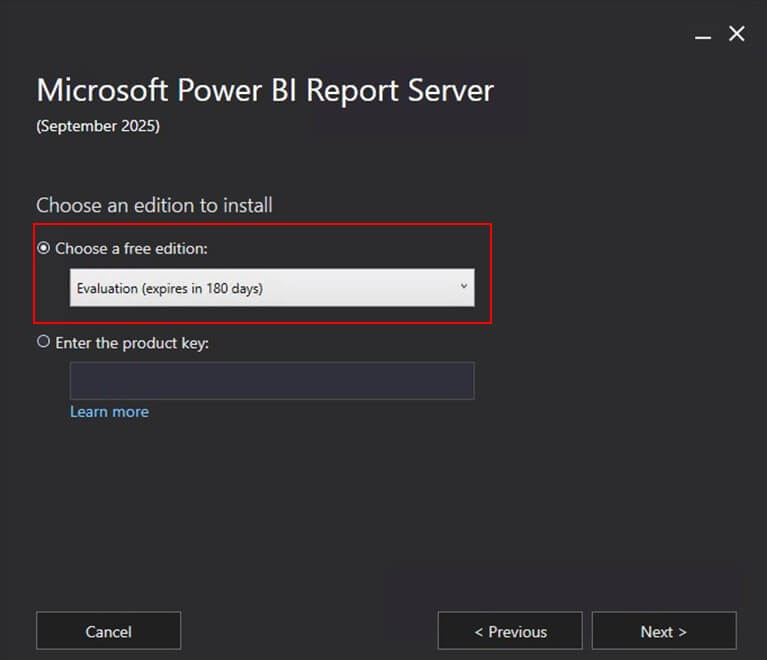 Choose an edition to install. If you a valid SQL Server 2025 license, choose the second option and enter the product key. If you want to use free edition, choose either 'Enterprise Evaluation edition(valid for 180 days) or Developer edition'. In our example, we are using Enterprise Evaluation edition.