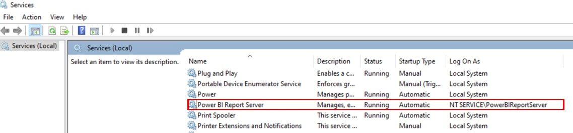Open services.msc and search for PBIRS Service. It runs with default account. You may change it to a service account as per your requirement. In our example, we are using the default account only.
