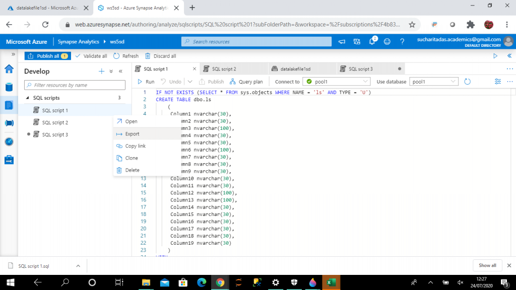 The script is open under the data page. I may connect to the existing SQL pools or SQL on-demand to run the scripts to copy data in the pool1 table.