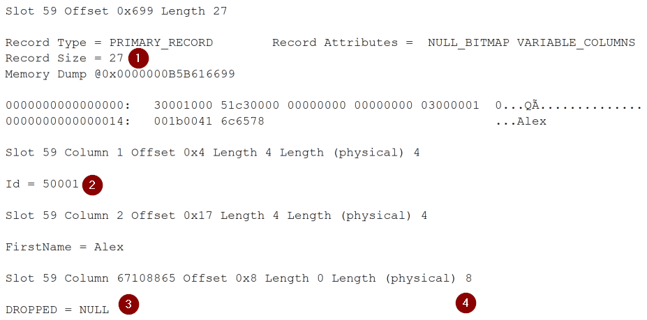 The new record has the same size (1), and you can see that it is the new record because it has the `Id = 50001` (2), and besides the dropped column (3), it still occupies 8 bytes (4). But, let's check, once again, the results of `DBCC SHOWCONTIG` because, at this point, if a new record was inserted and it has "one less column of data", it should be smaller, right?