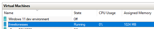 # create a new lab with 3 lines of code - Hyper-V New-LabDefinition -Name "Lab1" -DefaultVirtualizationEngine "HyperV" Add-LabMachineDefinition -Name "threelionesses" -Memory 1GB -OperatingSystem "Windows Server 2022 Datacenter (Desktop Experience)" Install-Lab