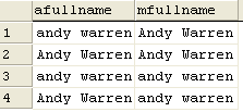 --#1, sensitive, where on the sensitive column select top 10 a.fullname as afullname, m.fullname as mfullname from instantforum_members m inner join andytemp a on m.fullname = a.fullname collate sql_latin1_general_cp1_cs_as where m.fullname='andy warren' --#2, sensitive, where on the insensitive column select top 10 a.fullname as afullname, m.fullname as mfullname from instantforum_members m inner join andytemp a on m.fullname = a.fullname collate sql_latin1_general_cp1_cs_as where a.fullname='andy warren' --#3, insensitive, where on the sensitive column select top 10 a.fullname as afullname, m.fullname as mfullname from instantforum_members m inner join andytemp a on m.fullname = a.fullname collate sql_latin1_general_cp1_ci_as where m.fullname='andy warren' --#4, insensitive, where on the insensitive column select top 10 a.fullname as afullname, m.fullname as mfullname from instantforum_members m inner join andytemp a on m.fullname = a.fullname collate sql_latin1_general_cp1_ci_as where a.fullname='andy warren'