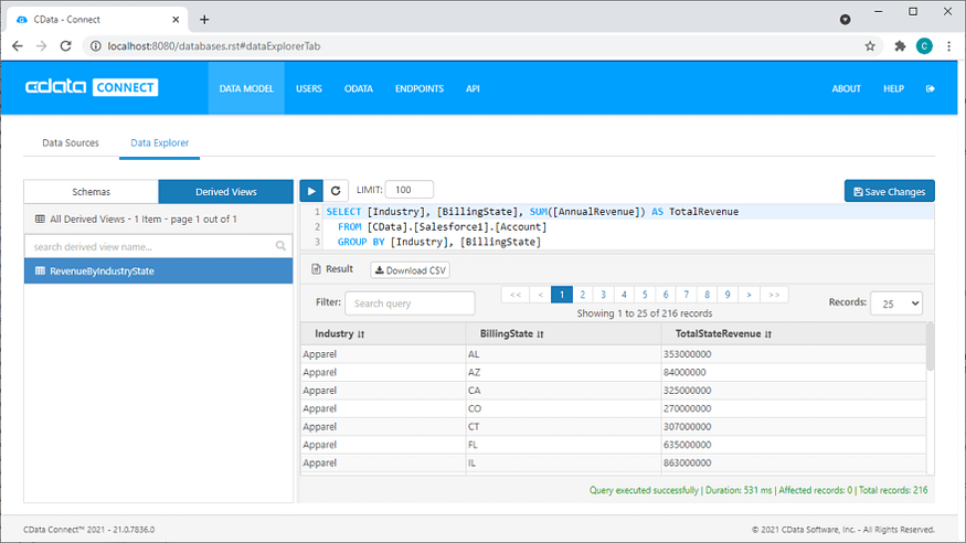 The Derived View feature of CData Connect lets you do just that — create a “view” of your SaaS, Big Data, & NoSQL sources. The derived view behaves exactly like a user-defined view, but the definition of the view resides directly within the CData Connect instance. To create a view, you first need to create a virtual database for your data.