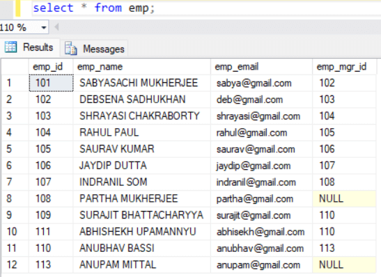 INSERT INTO EMP VALUES (101, 'SABYASACHI MUKHERJEE', 'sabya@gmail.com', 102); INSERT INTO EMP VALUES (102, 'DEBSENA SADHUKHAN', 'deb@gmail.com', 103); INSERT INTO EMP VALUES (103, 'SHRAYASI CHAKRABORTY', 'shrayasi@gmail.com', 104); INSERT INTO EMP VALUES (104, 'RAHUL PAUL', 'rahul@gmail.com', 105); INSERT INTO EMP VALUES (105, 'SAURAV KUMAR', 'saurav@gmail.com', 106); INSERT INTO EMP VALUES (106, 'JAYDIP DUTTA', 'jaydip@gmail.com', 107); INSERT INTO EMP VALUES (107, 'INDRANIL SOM', 'indranil@gmail.com', 108); INSERT INTO EMP VALUES (108, 'PARTHA MUKHERJEE', 'partha@gmail.com', NULL); INSERT INTO EMP VALUES (109, 'SURAJIT BHATTACHARYYA', 'surajit@gmail.com', 110); INSERT INTO EMP VALUES (110, 'ANUBHAv BASSI', 'anubhav@gmail.com', 113); INSERT INTO EMP VALUES (111, 'ABHISHEKH UPAMANNYU', 'abhishekh@gmail.com', 110); INSERT INTO EMP VALUES (113, 'ANUPAM MITTAL', 'anupam@gmail.com', NULL);