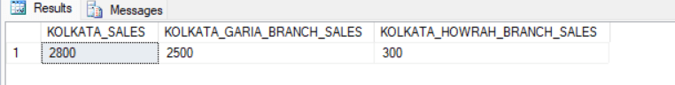 FROM KOLKATA_GARIA_SALES, KOLKATA_HOWRAH_SALES;In the query above, we define two CTEs, KOLKATA_GARIA_SALES and KOLKATA_HOWRAH_SALES, to obtain the total sales for each branch based out in Kolkata. Finally, we join both CTEs and calculate the total sales for Kolkata by adding up the sales of the two branches.