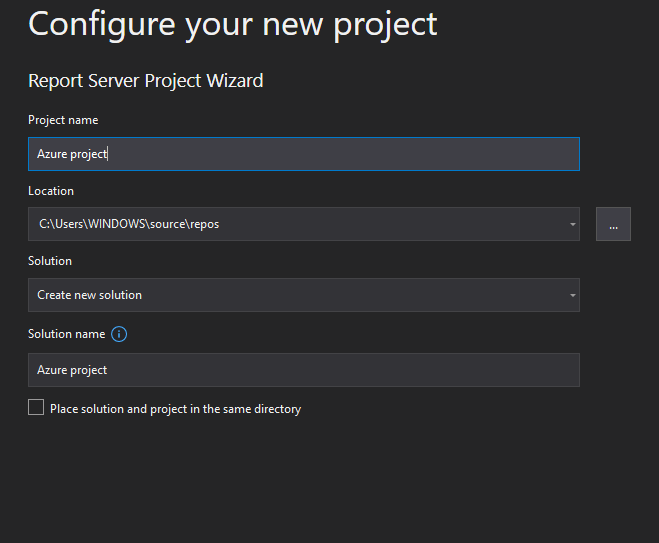 Create a project in Reporting ServicesSecondly, write a Project name and select a location.