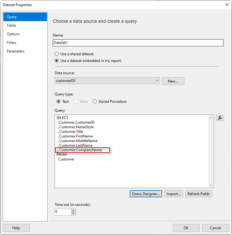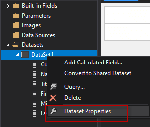 Properties of SSRSIn the Datasets, you can add more columns if required by right-clicking the Dataset and selecting Dataset Properties.