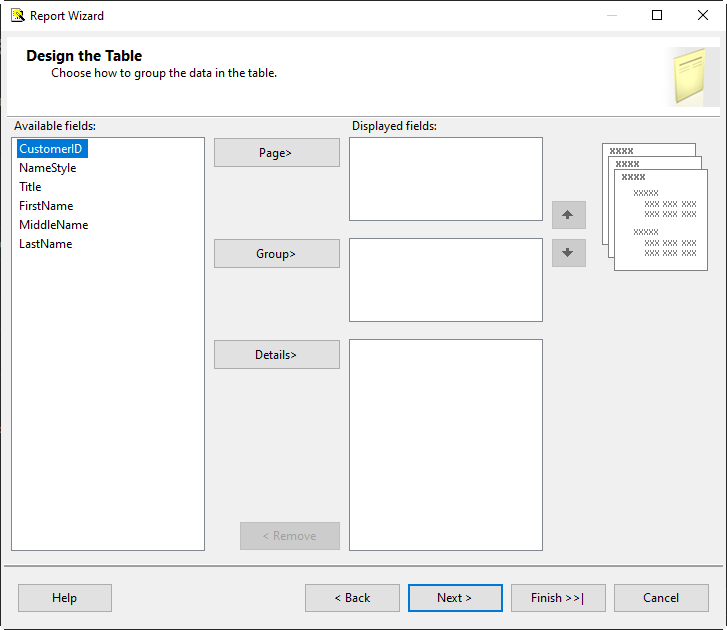 Matrix or tablixIt is possible to group fields or add them to pages. Press Next.