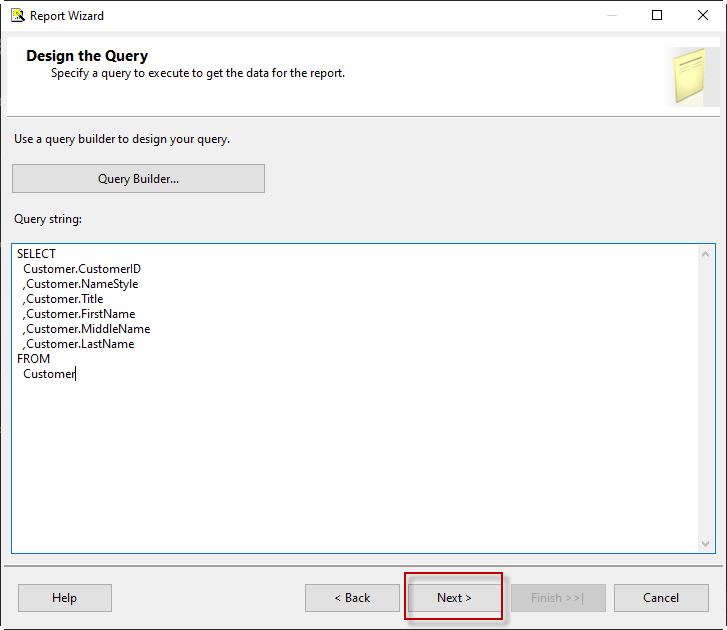 Include the columns in the queryIn addition, check if the query string generated by the query builder is OK and press Next.