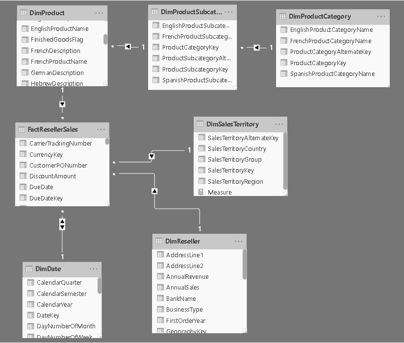 For example, from the model, DimFactResellerSales can reach DimProductCategory following only many-to-one relationships. Thus, the expanded version of DimFactResellerSales contains all the columns in DimProduct, DimProductSubcategory, and DimProductCategory tables. Moreover, DimFactResellerSales is on the many-to-one side of the relationship with DimDate, DimReseller, and DimSalesteritoy, therefore, the expanded version of DimFactResellerSales contains DimDate, DimReseller, and DimSalesteritoy too. In other words, the expanded version of DimFactResellerSales contains the entire data model.