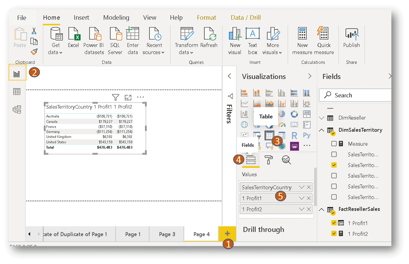 In Power BI Desktop we will create a new Calculated Columns called Profit1 in the factResellerSales Table. To do this follow the 5 steps outlined in the figures below.