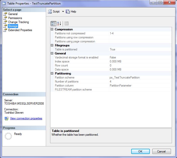 CREATE PARTITION FUNCTION [pf_TestTruncatePartition](int) AS RANGE LEFT FOR VALUES (100, 200, 300) GO CREATE PARTITION SCHEME [ps_TestTruncatePartition] AS PARTITION [pf_TestTruncatePartition] TO ([PRIMARY], [PRIMARY], [PRIMARY], [PRIMARY]) GO CREATE TABLE [dbo].[TestTruncatePartition]( [PartitionParameter] [int] NOT NULL, [RowID] [int] NOT NULL, [RowValue] [varchar](50) NULL, CONSTRAINT [PK_TestTruncatePartition] PRIMARY KEY CLUSTERED ( [PartitionParameter] ASC, [RowID] ASC ) ON [ps_TestTruncatePartition]([PartitionParameter]) ) ON [ps_TestTruncatePartition]([PartitionParameter])