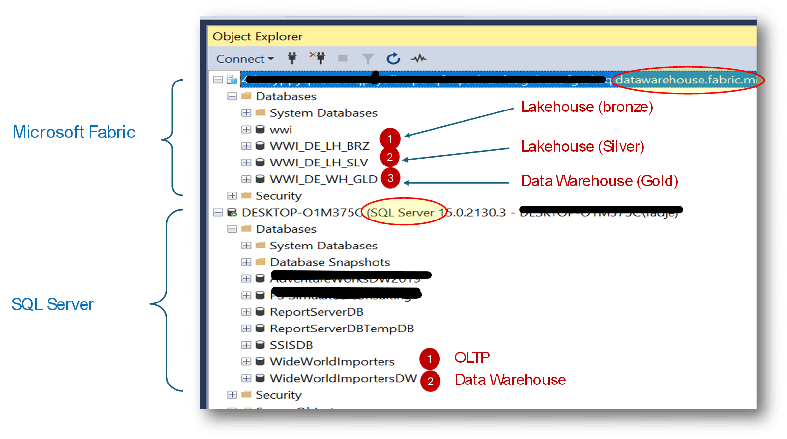 To begin the demystification process, we used SQL Server Management Studio (SSMS) to connect to both the WWI relational data warehouse on SQL Server and the Microsoft Fabric environment, as shown in Figure 1 below.