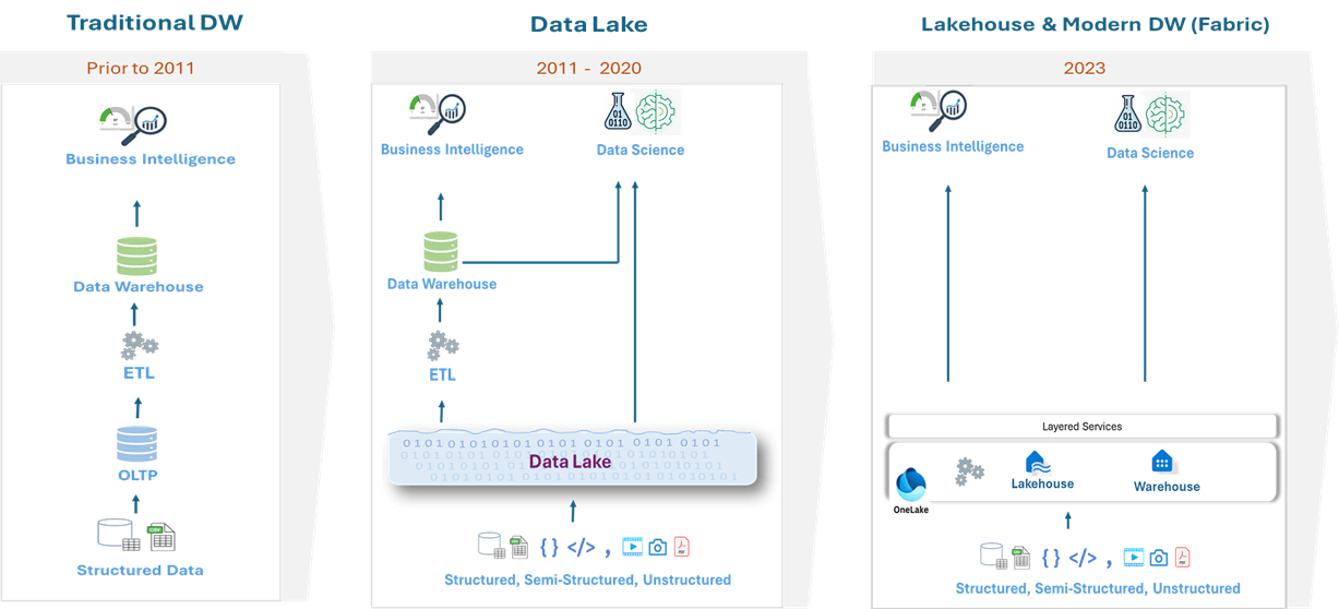 Figure 2 illustrates the transition from traditional data warehouses to data lakes and, more recently, to Lakehouse architecture, reflecting the evolving needs of organizations in managing data growth and integrating advanced analytics.
