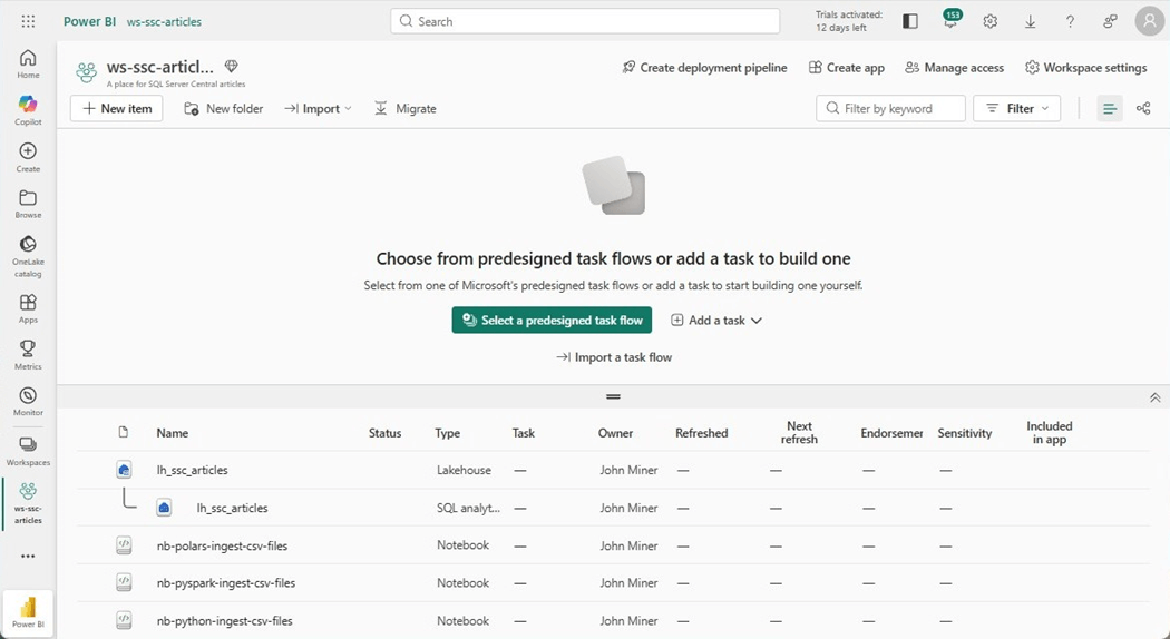 Today, we are going to work on a new notebook named “nb-polars-ingest-csv-files.” The image below shows the objects in our workspace. Please note, the data will be stored in a lakehouse named “lh_ssc_articles” which has its own SQL Analytical endpoint.