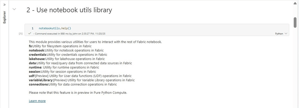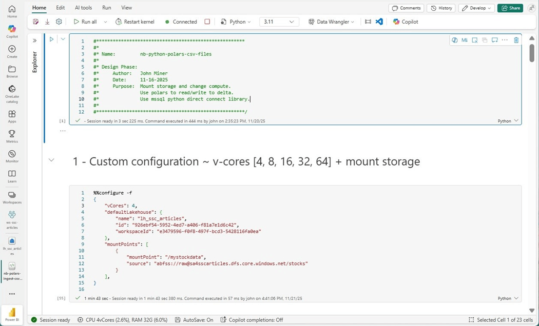 If you want to change the size of the Fabric Python Notebook session, use the configuration command. Just remember creating custom size and mounting storage takes an additional minute or two. The new notebookutils library is useful when working with the file system, calling other notebooks and many other tasks.
