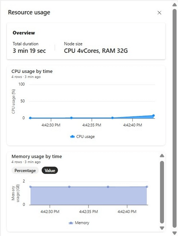 Double clicking the computing information at the bottom of the notebook brings up the usage screen. We can keep an eye on how the computing cores and memory are used by our notebook over time.